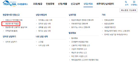 ▶ 현금영수증 미발급 클릭 후 해당내용 정확하게 작성 후 제출