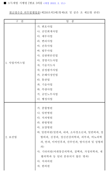 아래 파일은 소득세법 시행령 별표 3의3에 따른 현금영수증 의무발행 업종 전체 목록입니다.