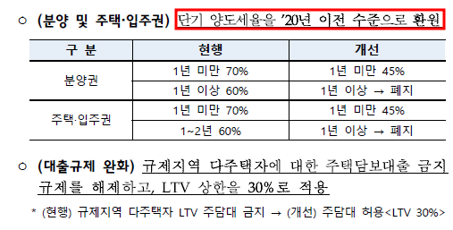 - 보유주택 주담대 규제 완화 및 구입시 동일 기준 적용