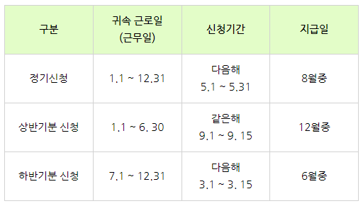 상반기에 근무했던 근무분에 대한 근로장려금은 9월 15일 까지 신청을 받고, 같은해 12월에 지급 받습니다.