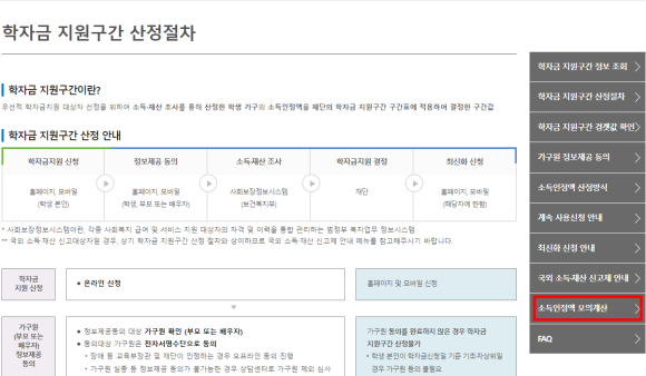- 우측 메뉴 소득인정액 모의계산 클릭