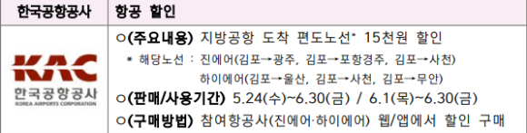 5.24~6.30일까지 구매가능하고, 6.1~6.30일까지 사용할 수 있습니다. 진에어, 하이에어를 통해 할인이 가능합니다.