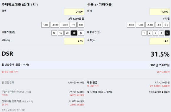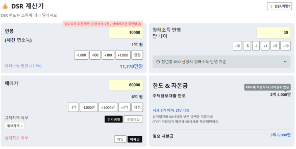 DSR 계산기를 인터넷 상에 검색하면 꽤 많이 나오는데요. 그 중에서 제법 상세히 나오는 DSR 계산기가 있어서 링크 첨부합니다.
