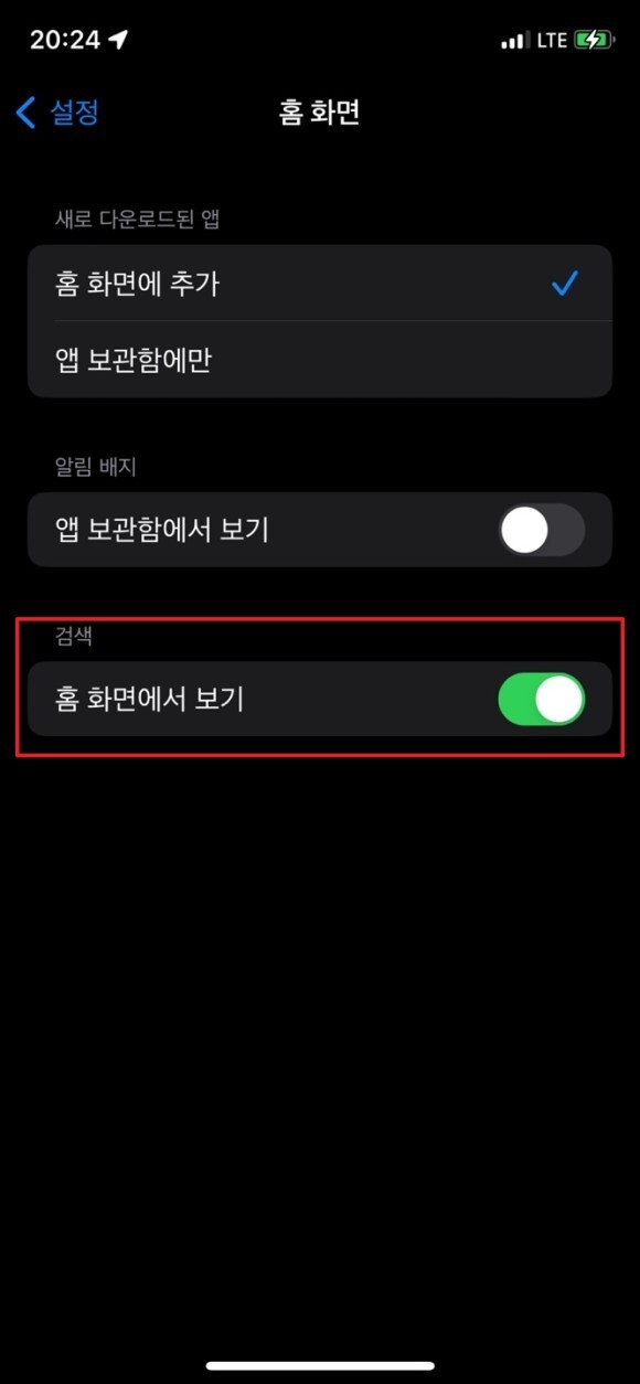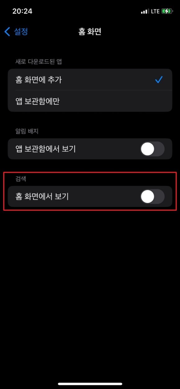 - 검색 '홈 화면에서 보기' 해제